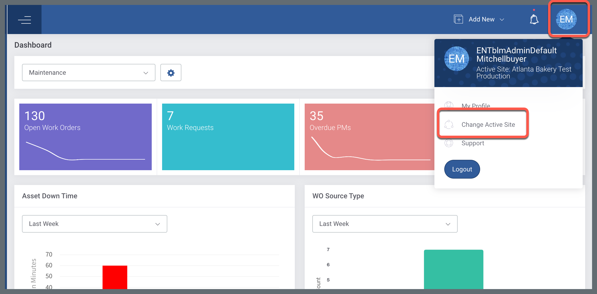 - Select Save. You should now be viewing the new site's data, equipment, work orders, parts, etc...
