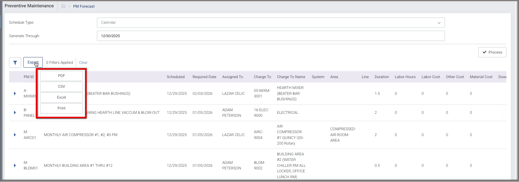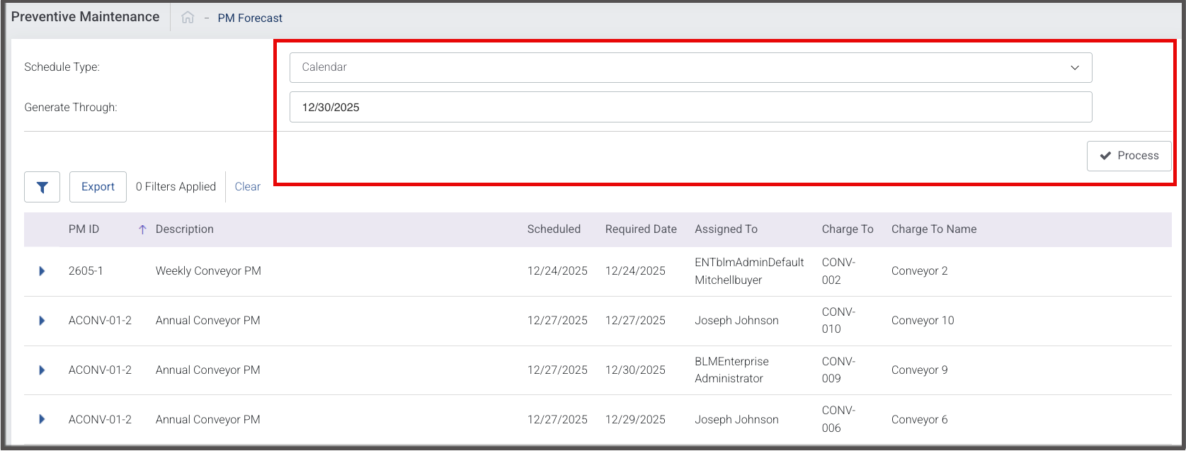 - A list of PMs will appear that meet the selected Generate Through Date.
