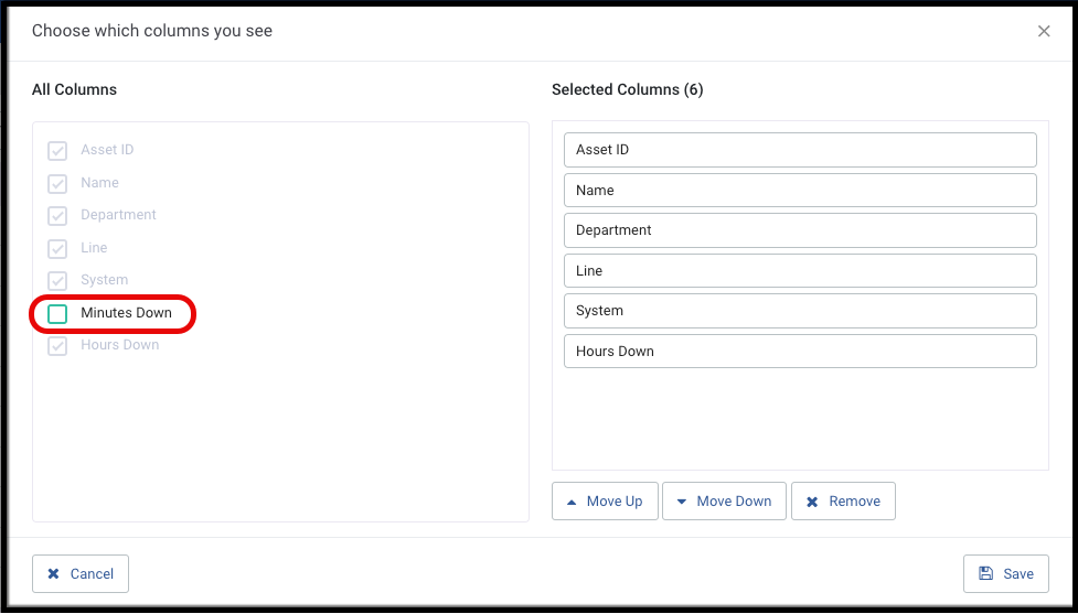 | Hours Down | Total Hours Down ( Total of accumulated down time minutes / 60 ) |