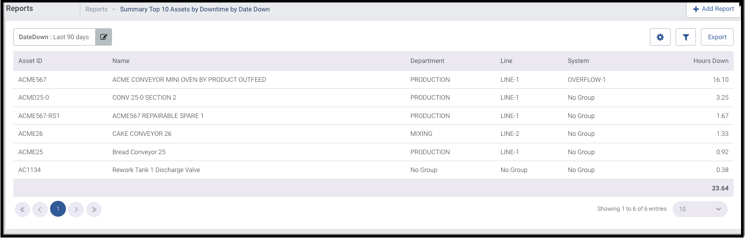This report provides a list of The Top 10 Assets by the Accumulated total of Downtime minutes entered for the Assets for the Date Down range selected.