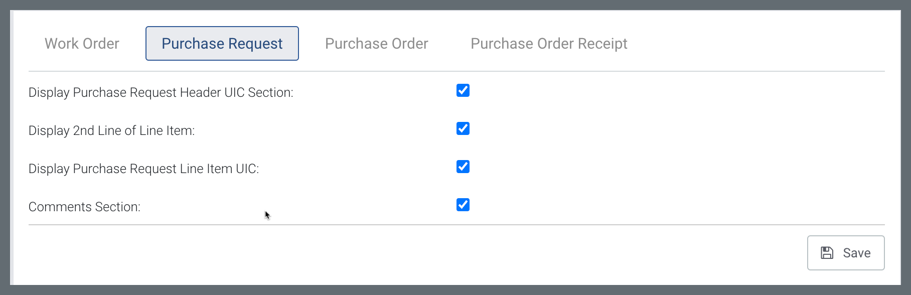 - Make sure Purchase Request is selected at the top menu. Below is what your purchase request configuration settings should look like: