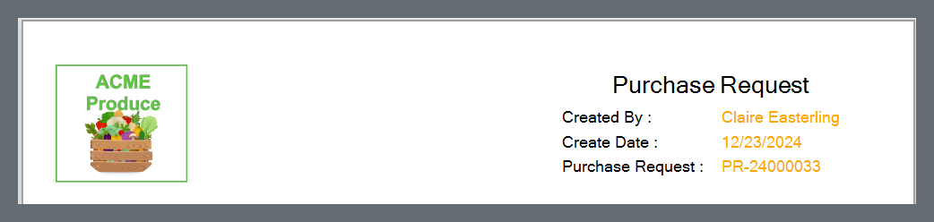 The header will include your current client / site logo as well as the basic details of your purchase request (who created it, date of creation, and ID). This information will appear by default, though for help with adding your picture, see Setting up Site Details.