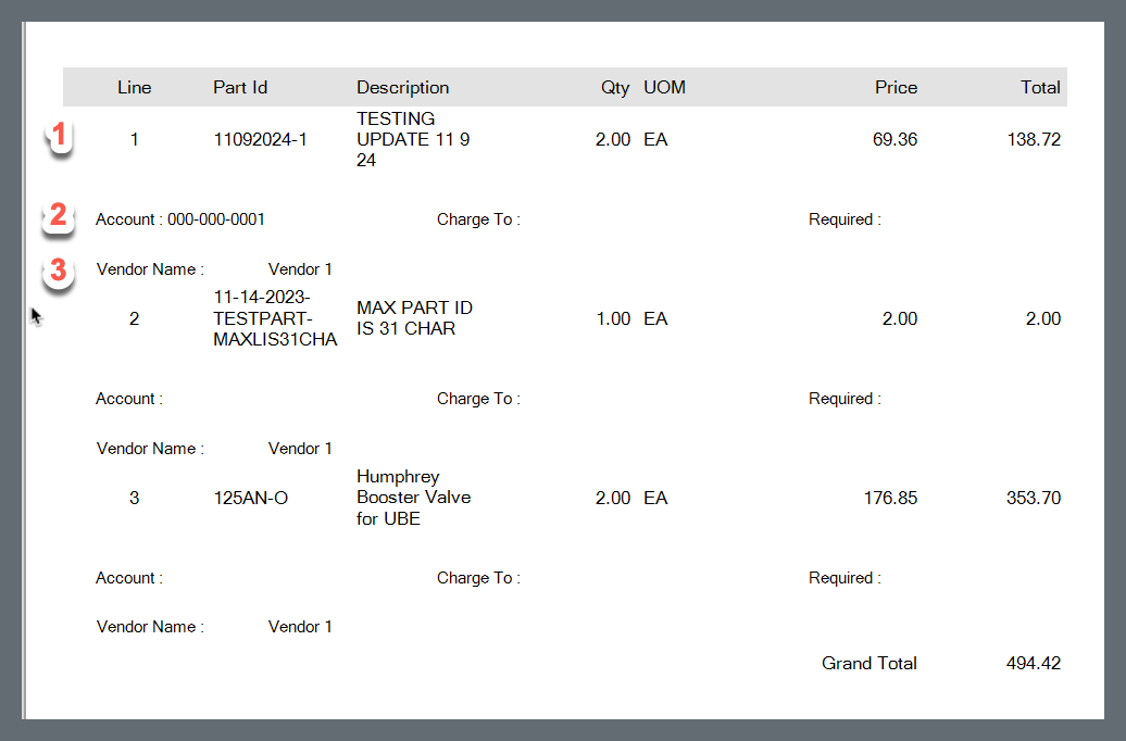Line 2 gives your line item charge to information, such as the account used. This can be modified by editing your purchase request line item or by editing your part. To have this section you must have the Display 2nd Line of Line Item checkbox selected under Form Configuration (see above).
