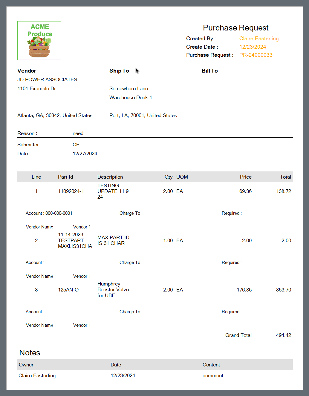 This section includes the addresses of your vendor, where you would like parts to be shipped, and where to bill the charge to. It also includes the reason for purchase, which is entered when creating the request. This section is included by default, though for help with the vendor, ship to, and bill to addresses, see Editing a Vendor or Add or Edit an Account. The purchase request details can be modified by Editing Purchase Requests.