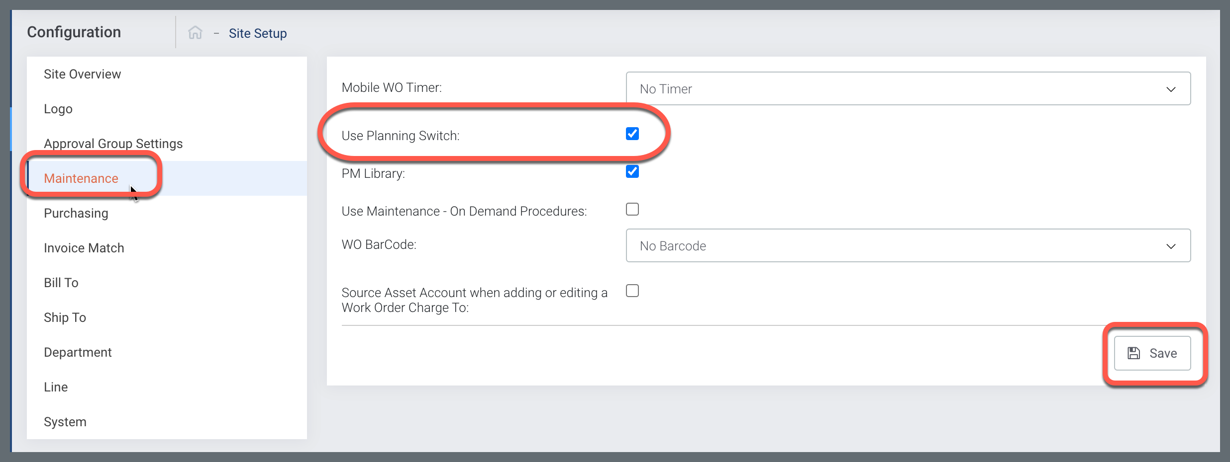- Select Maintenance and then select the Use Planning Switch checkbox.