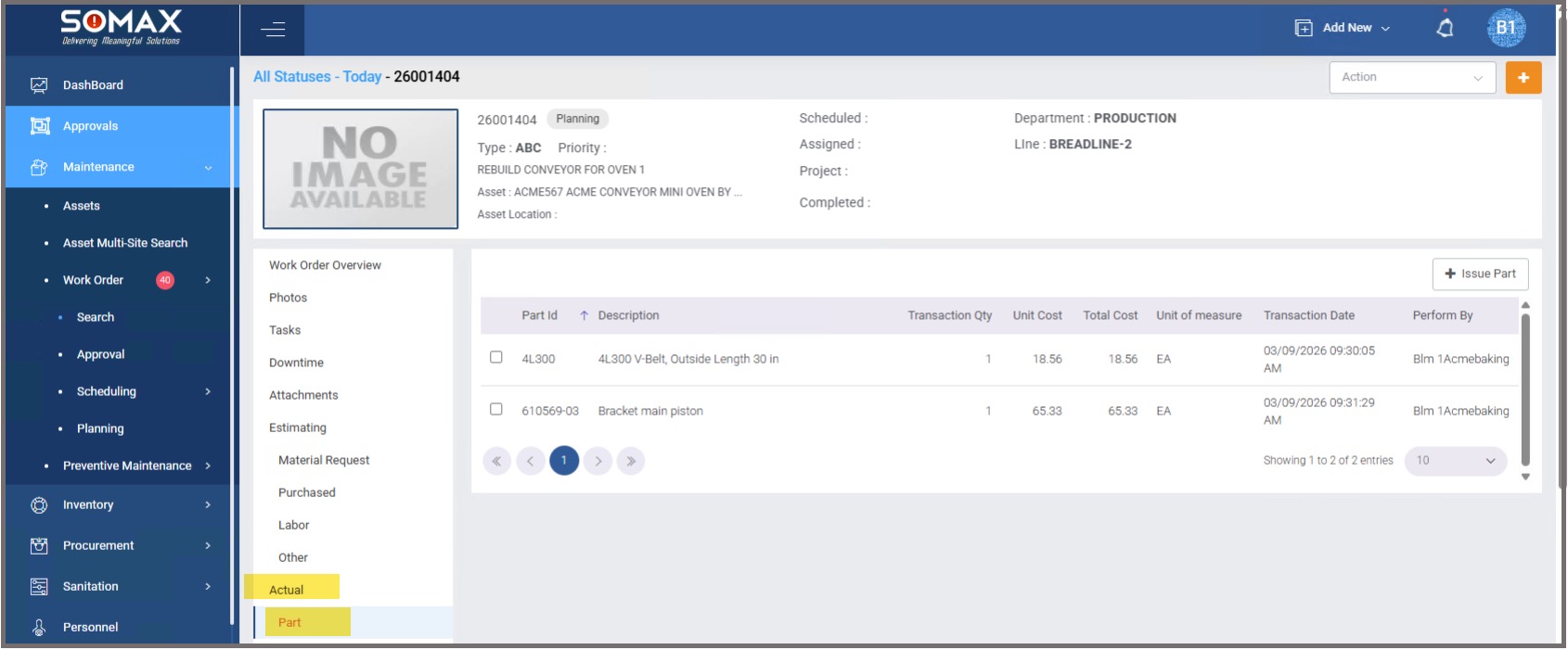 The Issued Parts are displayed